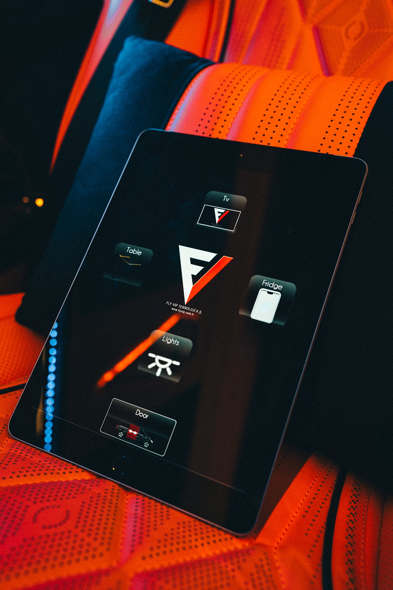 Inside, seven seats. Each a fully reclining leather captain’s chair with its own touchscreen control. Ambient lighting, on demand entertainment, chilled fridges, and total silence when you need it